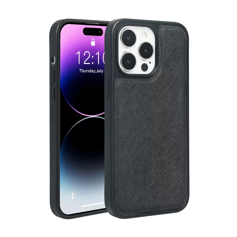 The Saffiano genuine leather magnetic phone case uses high-quality, environmentally certified leather that remains elastic even when thinned to 0.6mm. It features an N52 magnetic coil compatible with Apple’s chargers, zinc alloy buttons, and a protective metal camera circle, ensuring durability and superior performance.