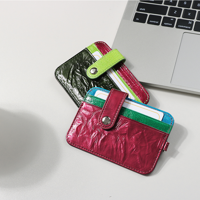 This color blocking card holder features a contrasting design to enhance the visual appeal, crafted from premium leather with a delicate texture. The front is equipped with exquisite buttons, which are easy to open and close, and can firmly fix the card to prevent it from slipping. The internal multi grid partition is reasonable, which can classify and store bank cards, bus cards, etc. It is compact and portable, easy to put into pockets or small bags, and combines aesthetics and practicality.